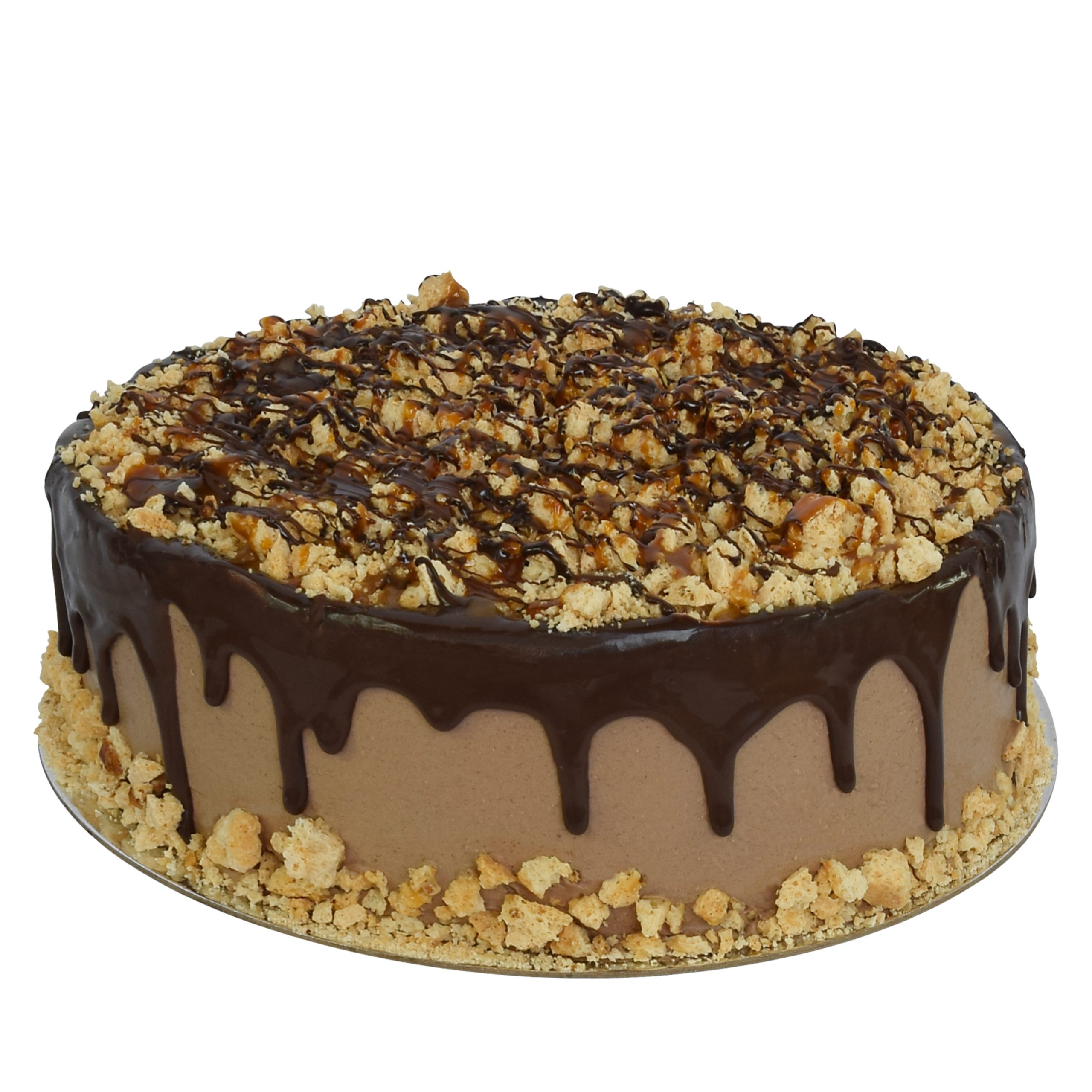 A dark bourbon sponge layered with fudge and caramel, topped with meringue pieces and caramel drizzle